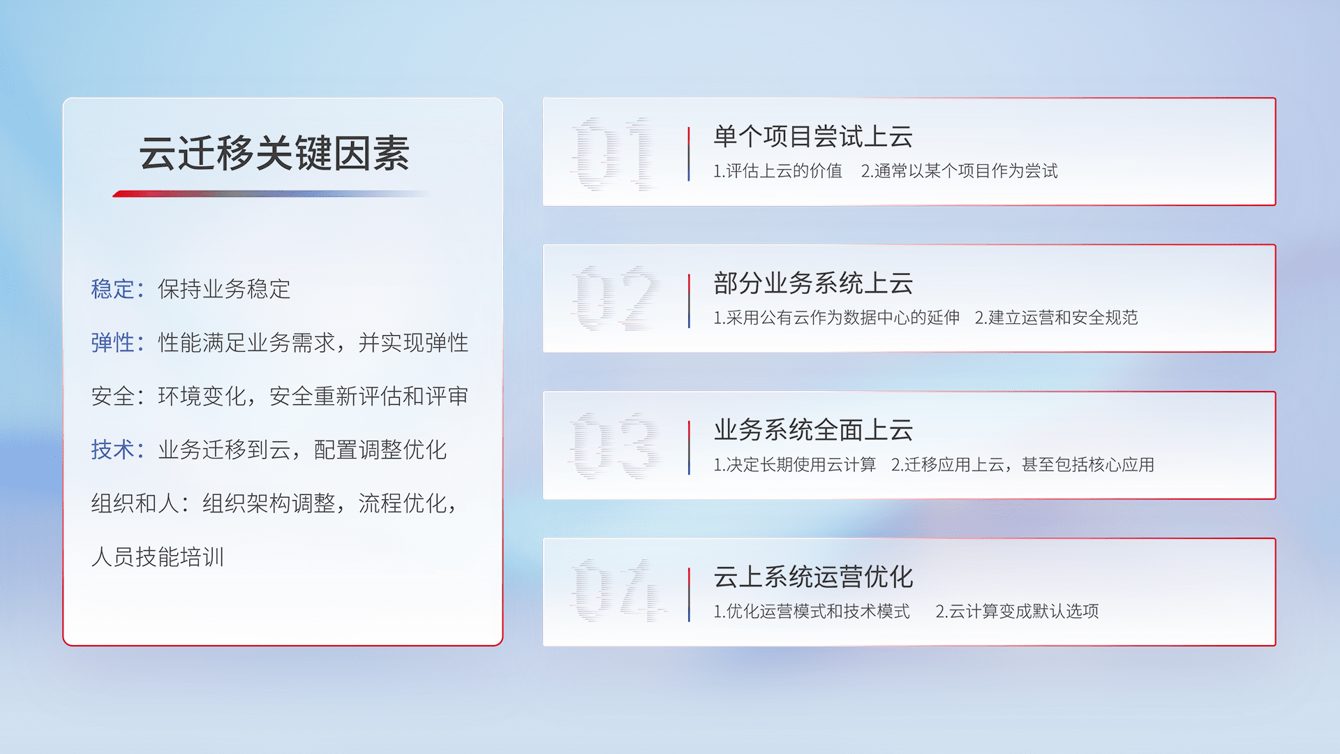 结合实际业务,,从规划设计、、、、云平台选型、、、、云原生改造、、、、数据迁移、、、集成交付,,迁移全过程为客户识别最佳上云路径,,做好风险识别管理,,设计网络架构、、身份权限、、、、安全审计合规、、、、操作审计、、、日志审计、、监控告警策略、、、、多站点容灾设计等,,对云上基础设施进行整体规划,,,提升IT治理水平,,,以满足弹性、、、高可用、、、、高性能的需求。。