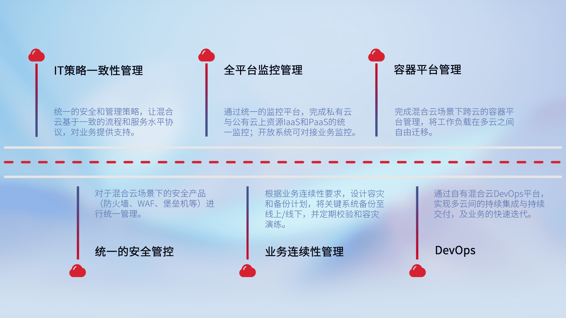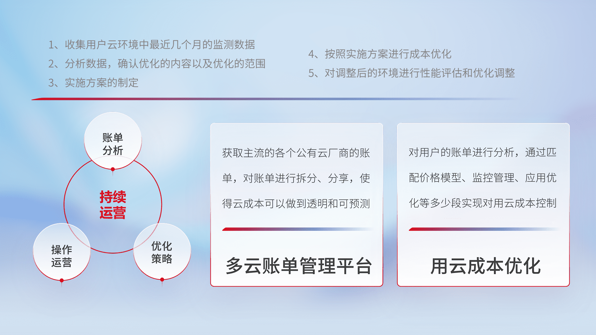 通过多云纳管,,以统一的资源数据模型把客户的云资源进行抽象和封装,,,进而实现对多云资源的统一操作,,,保障云资源管理的可靠性、、稳定性与可用性。。。量身定制化运维内容,,,配置、、开发运维、、、补丁管理、、、备份、、监控、、、、认证和访问管理、、审计和日常巡检等,,,,保障在用云过程中的可靠度,,稳定度以及高可用率。。
