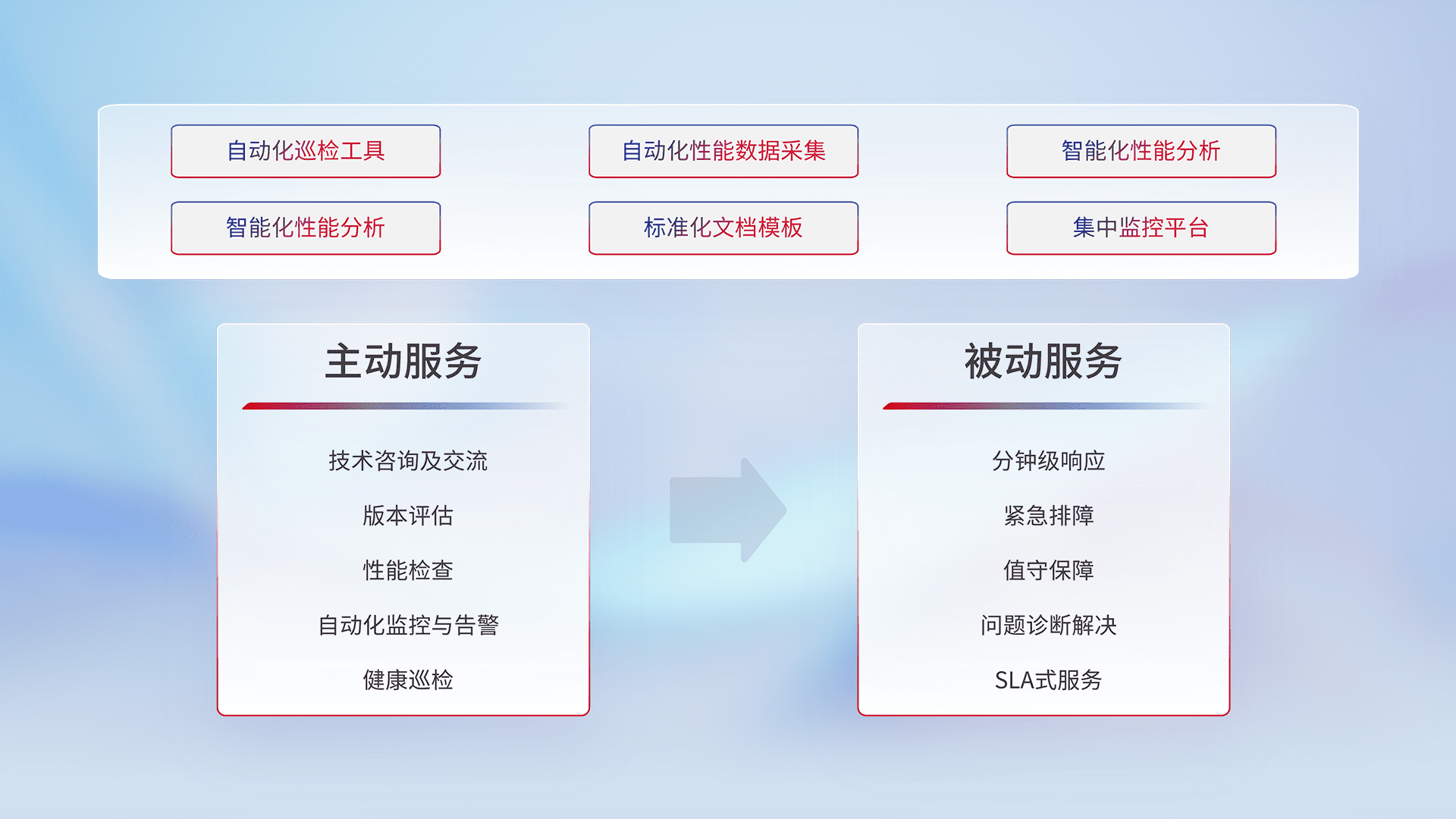 智能化工具和标准化文档,,,保障服务质量,,,,提供主动服务(包含技术咨询、、、、版本评估、、性能检查、、、、自动化监控与告警、、、健康巡检)和被动服务包含(分钟级响应、、、、紧急排障、、值守保障、、、、问题诊断解决、、、、SLA服务)。。。