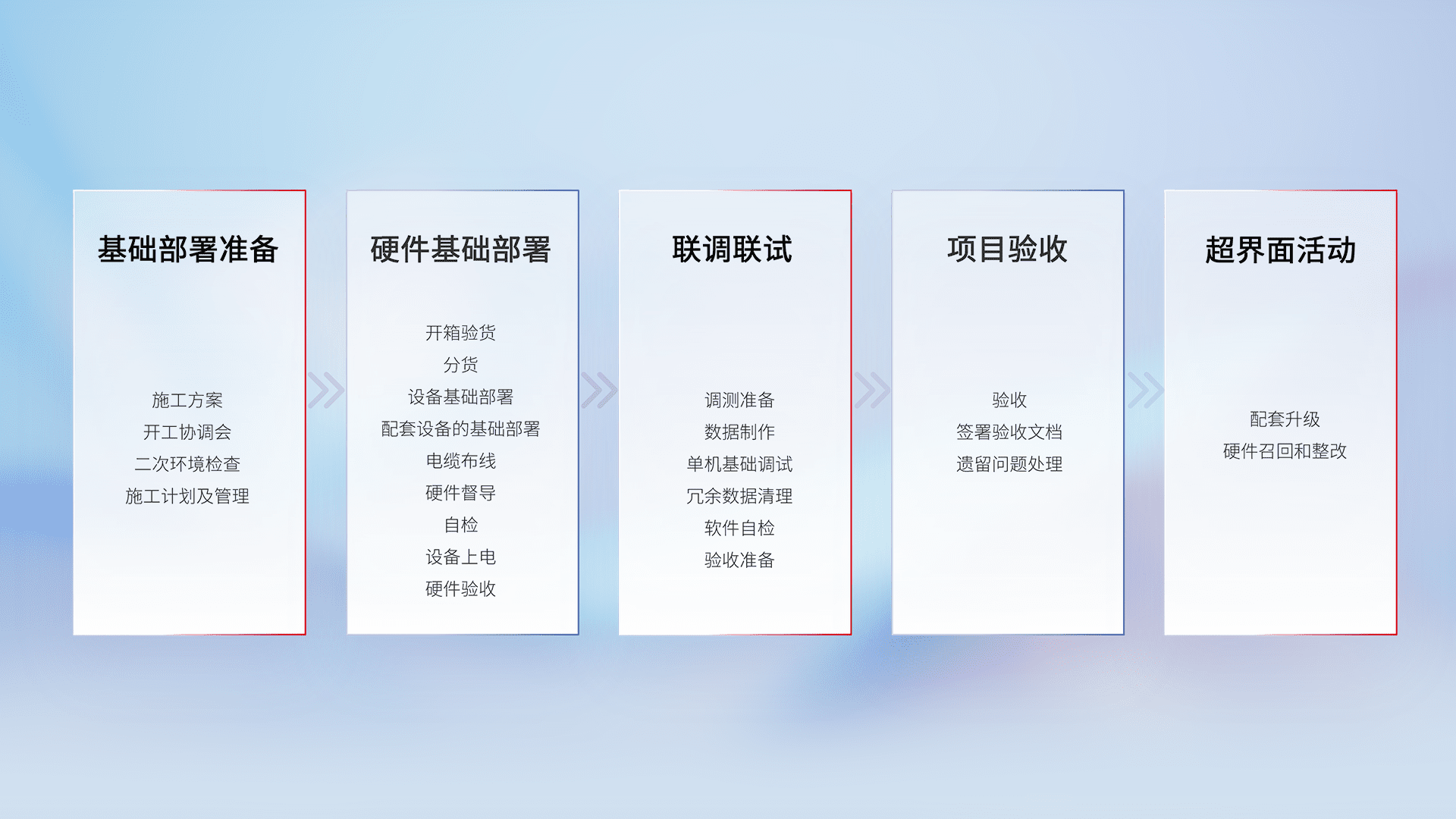 从基础部署准备、、、硬件基础部署、、、联调联试、、、、项目验收、、、越界面活动的全过程可追溯,,,,保证施工质量和进度。。